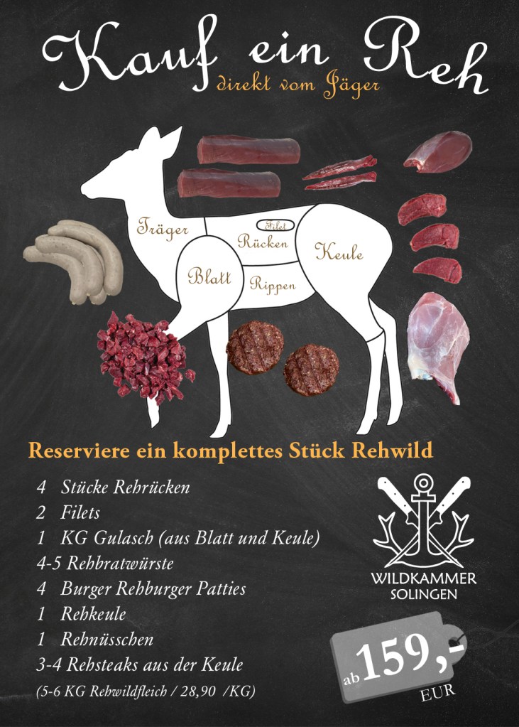 Ihr bekommt von uns ein komplettes Stück Rehwild in bis zu 35 verschiedene alltagstaugliche Portionen und Produkte oder nach Euren Wünschen aufgeteilt und verpackt.