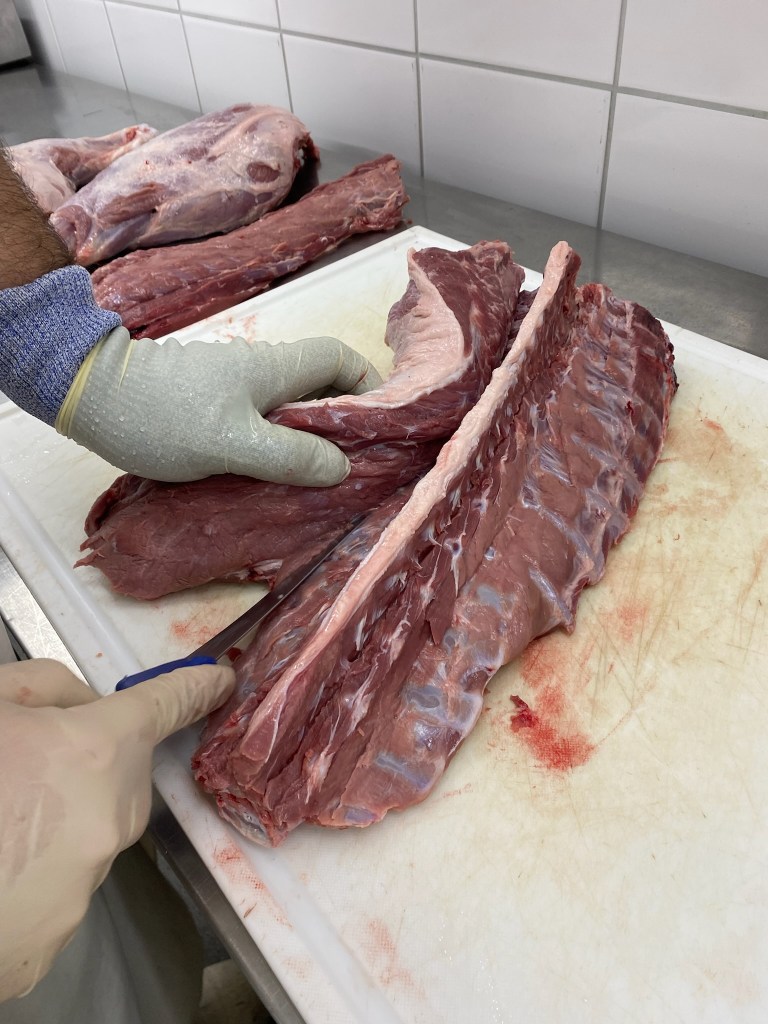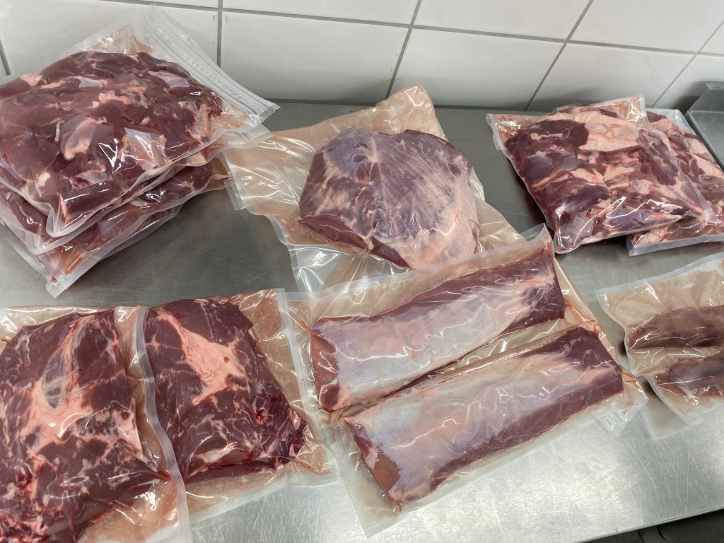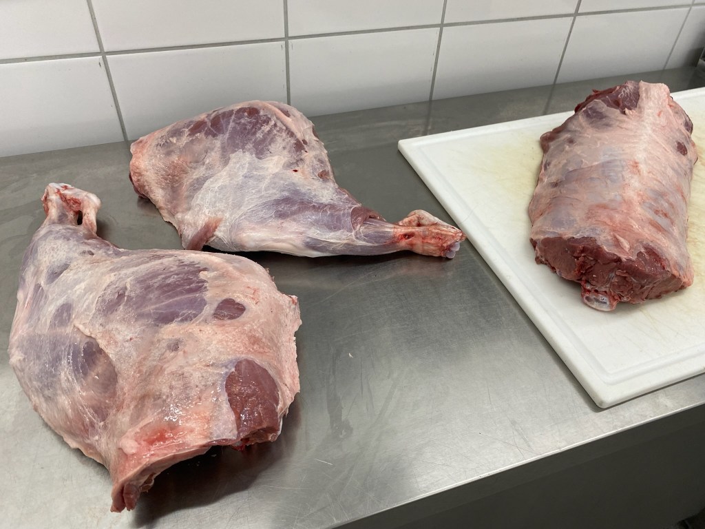 Hier v.l.n.r: Keule ohne Knochen, Gulasch, Rücken und Nacken.