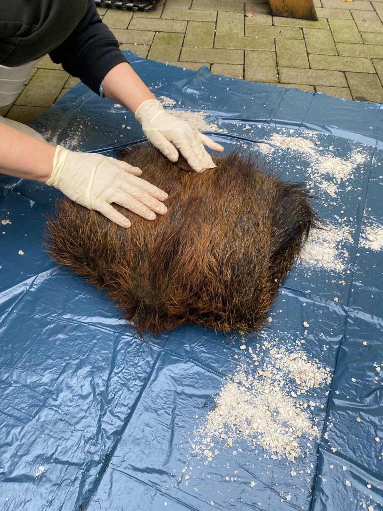 Die Schwarte (Fell) wird für das spätere Gerben konserviert, erst einmal gesalzen..,