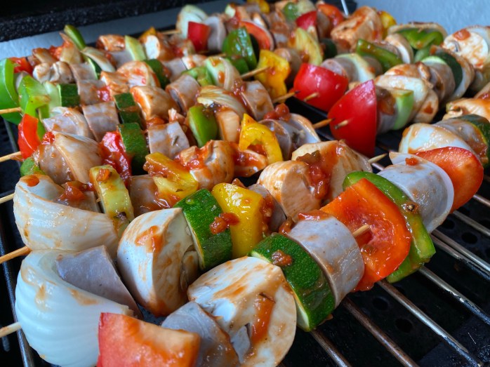Grill-Idee: Gemüsespieße mit Wildbratwurst.