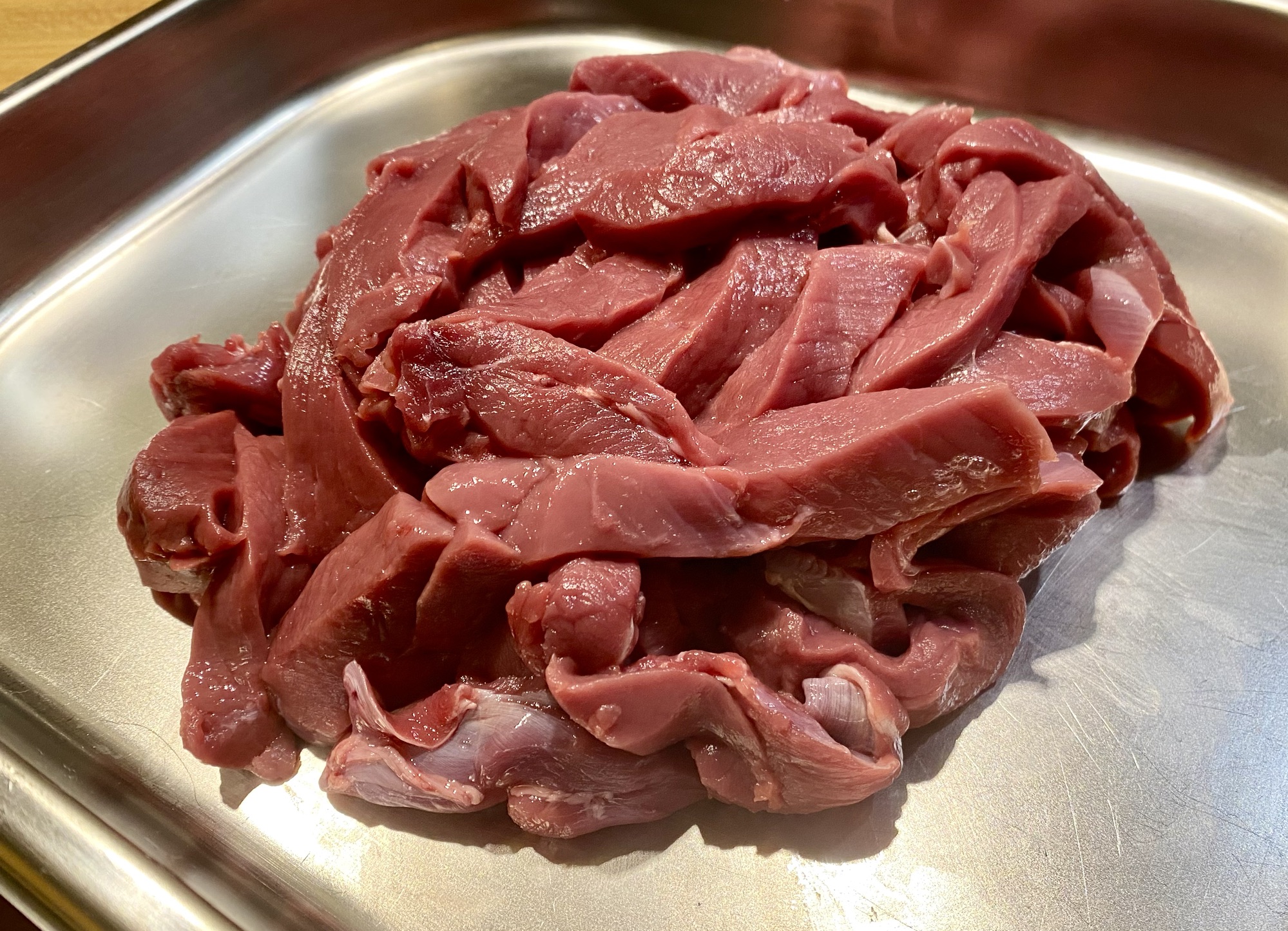 Die Rehkeule oder Fleischstücke mit einem scharfen Messer in feine Scheibchen oder Streifen schneiden.