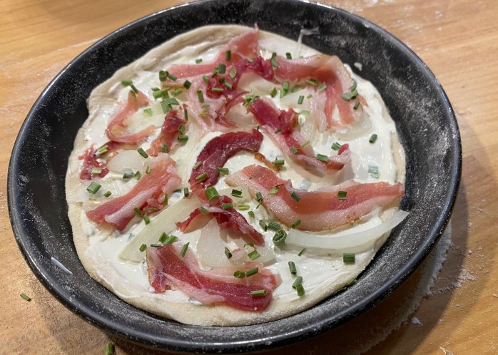 „Flammkuchen mit Wildschweinspeck und Zwiebeln“ vorbereitet. Diese müsst Ihr nur 4-8 Minuten im Backofen aufbacken und genießen.