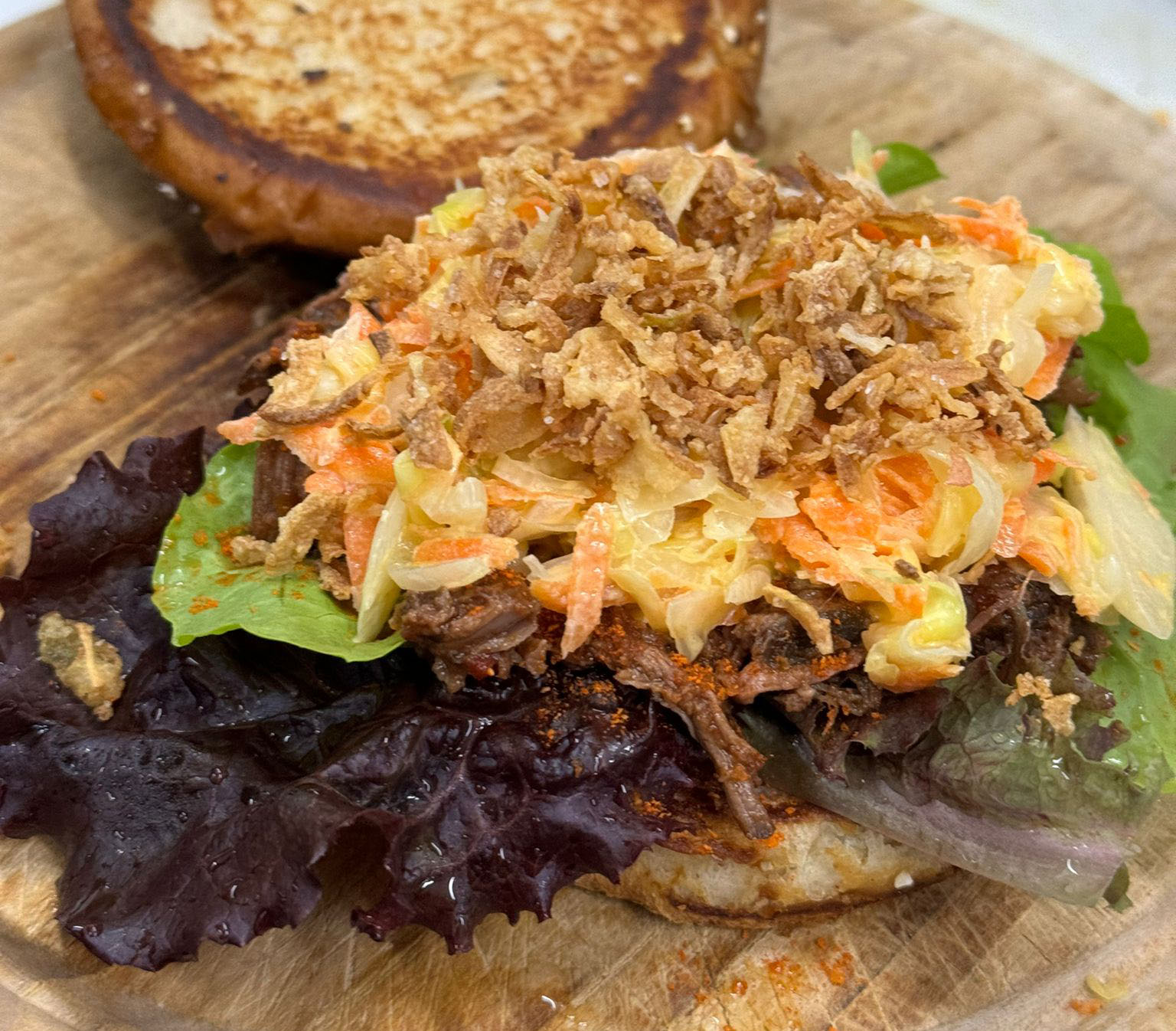 Der Burger kommt in einem Laugen-Bun mit Salat, hausgemachtem Coleslaw und Röstzwiebeln.