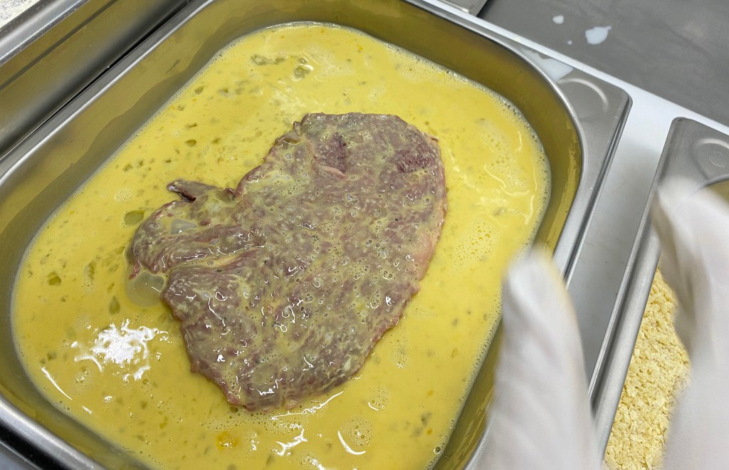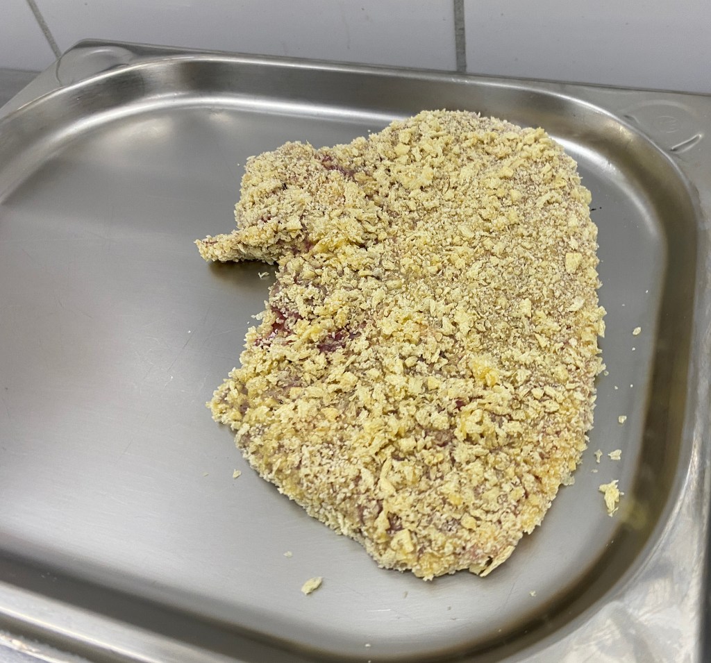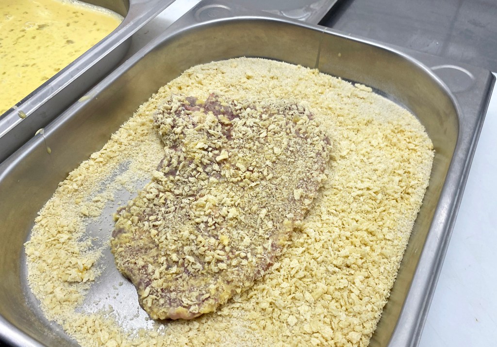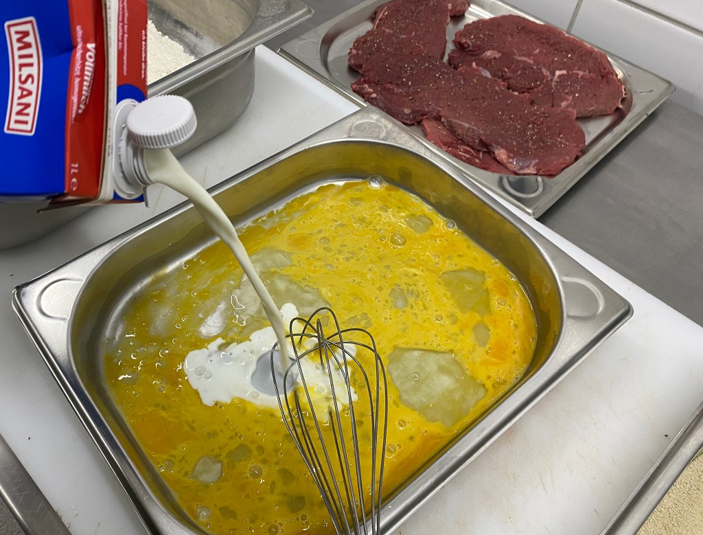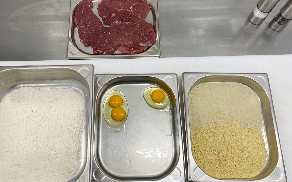 V.l.n.r.: Mehl, Ei, Panier und PankomehlEinen Schuß Milch zu den Eiern geben und verquirlenMischung 1:1 Pankomehl und PaniermehlPanadeDas Fleisch von beiden Seiten mehlieren und abklopfenDas mehlierte Fleisch durch ddie Eiermischung ziehenDas Fleisch herausnehmen und abtropfen lassenDas Fleisch panierenFertig paniertes Stück