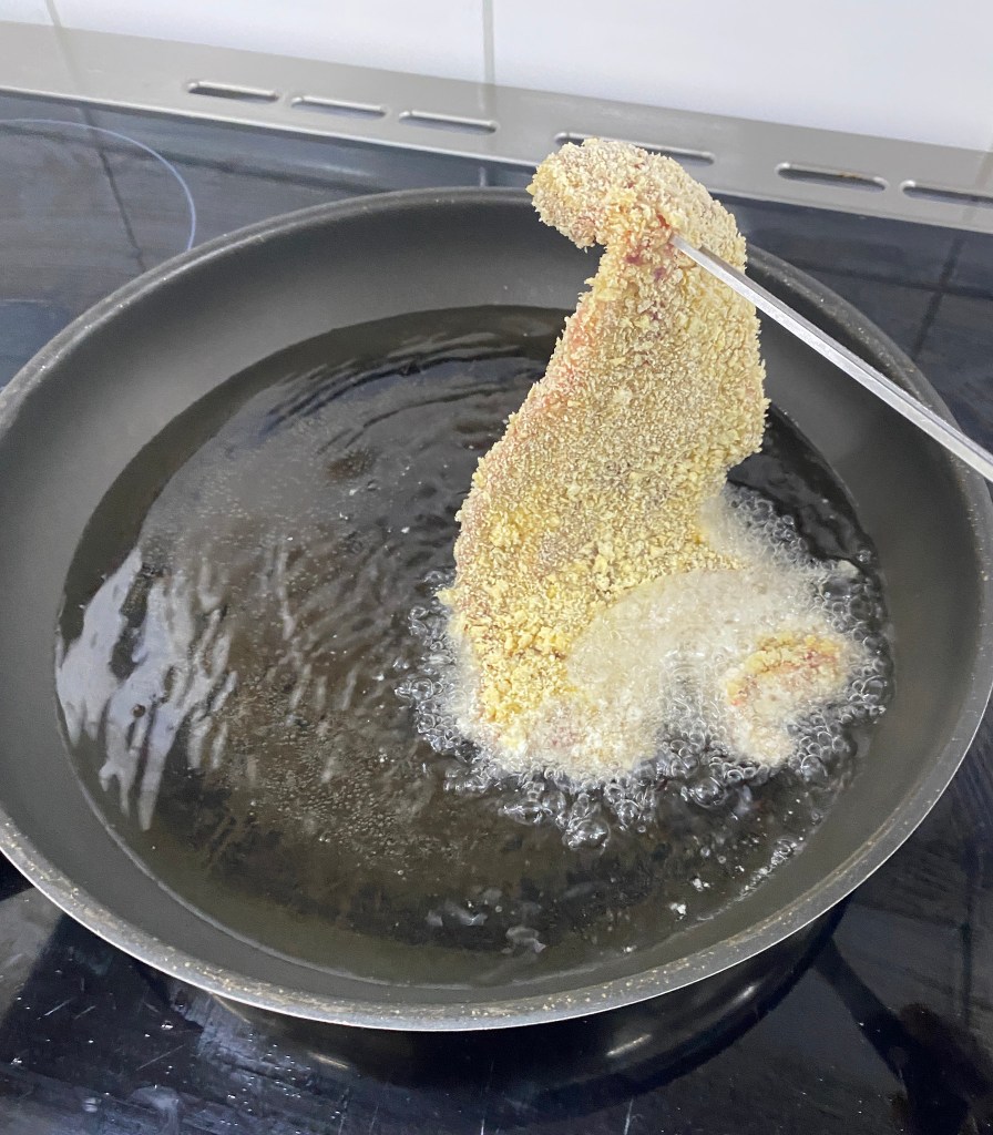 Das Fleisch in das heiße Fett gebenGoldgelb frittieren