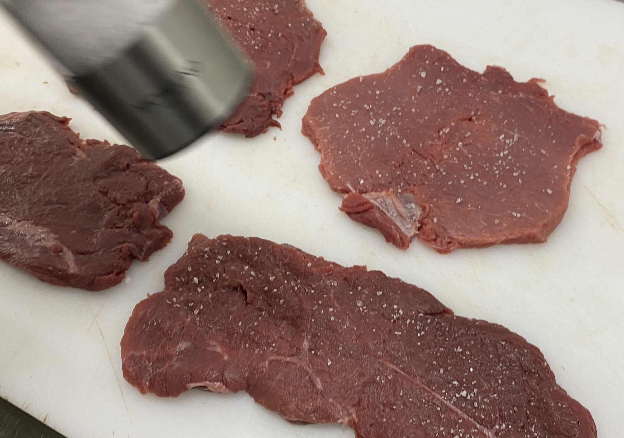 Nach dem Plattieren das Fleisch Salzen und Pfeffern.
