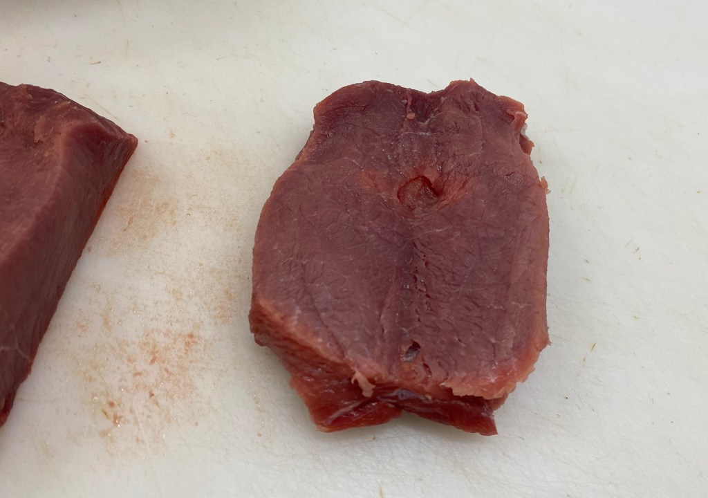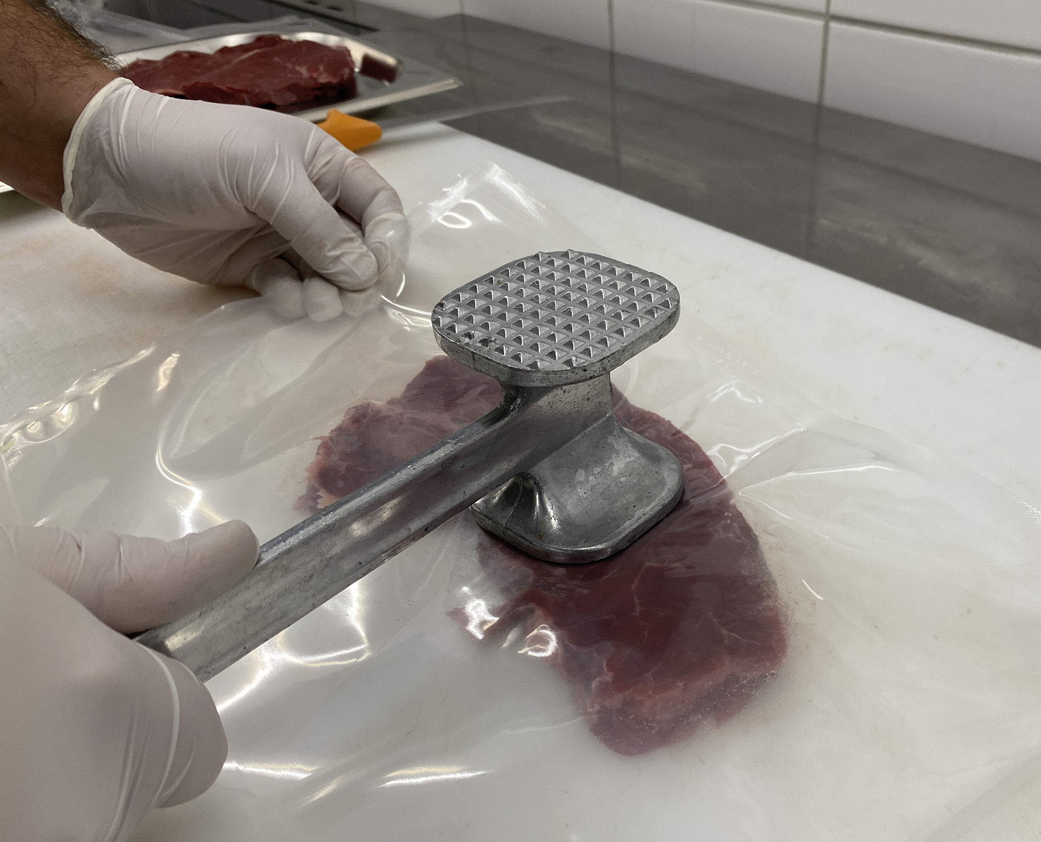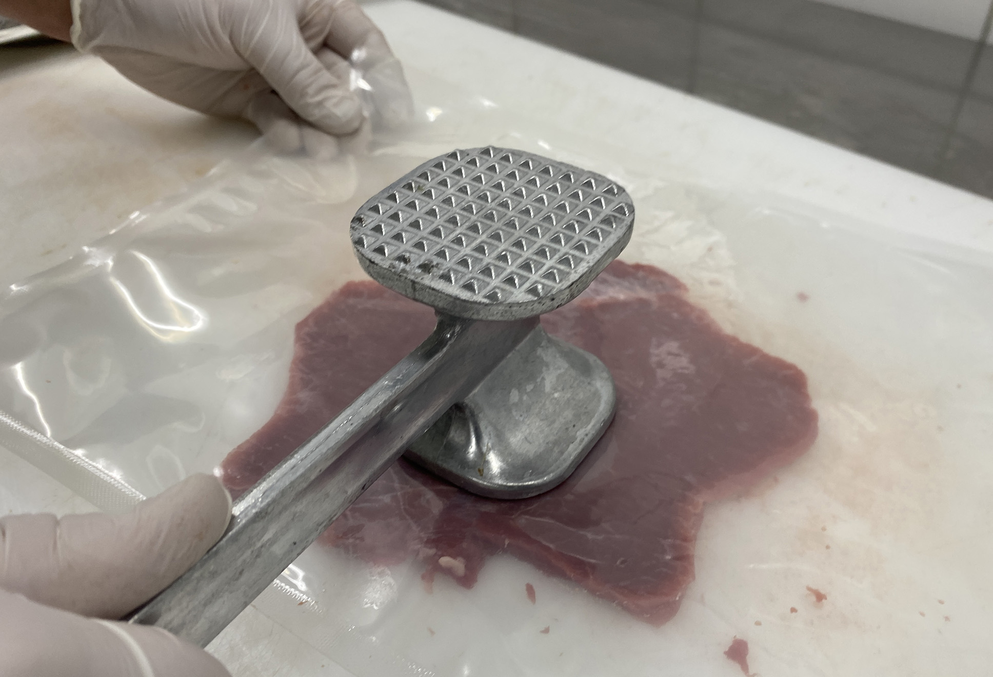 Um ein Festkleben des Fleisches am Klopfer oder am Schneidbrett zu verhindern, legt am besten ein Stück Frischhaltefolie oder einen Zipbeutel auf das Fleisch bevor Ihr das Fleisch plattiert.