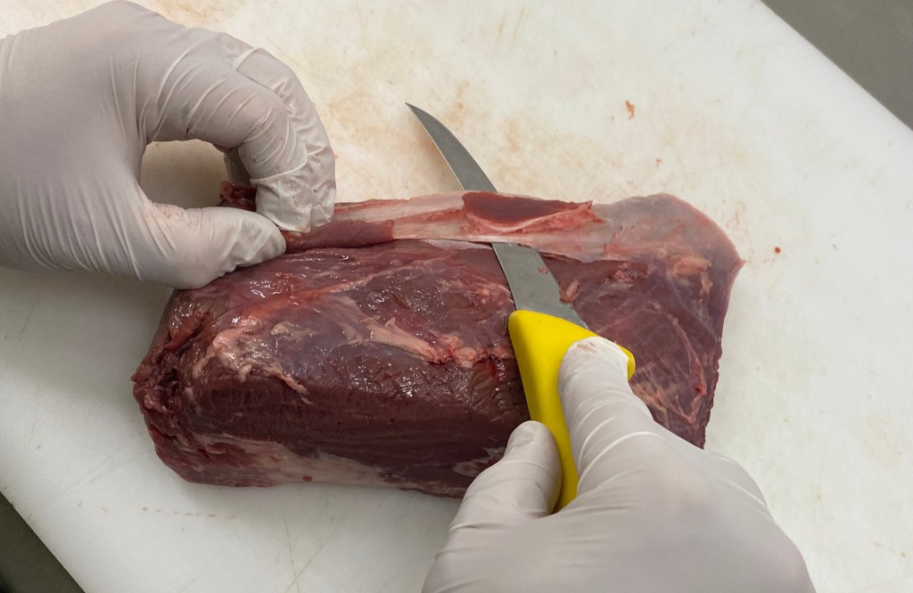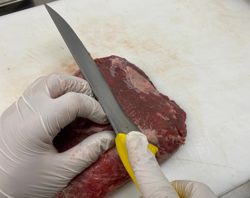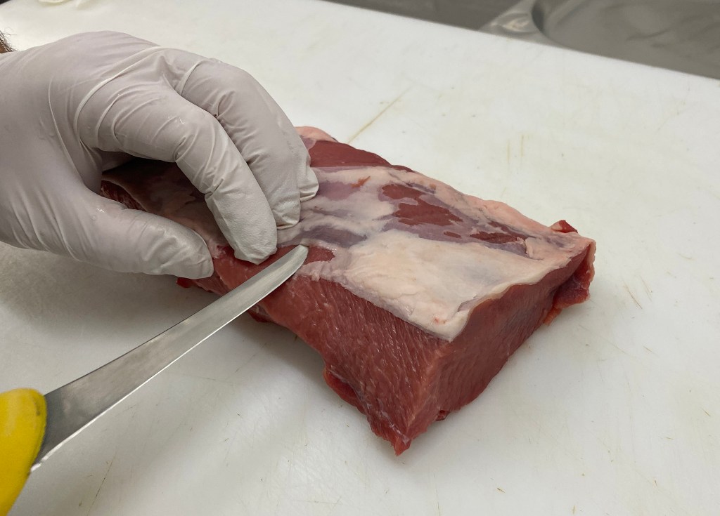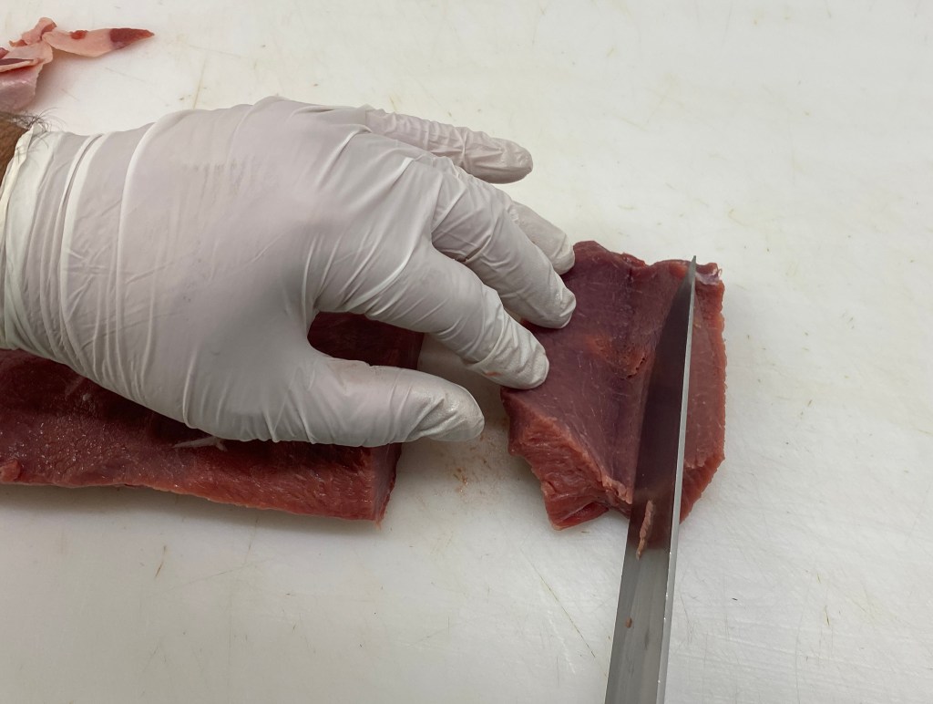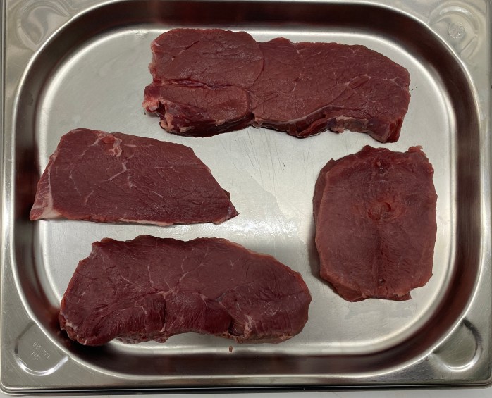 Hüfte & Nuß: Fingerdicke Scheiben gegen die Fleischfaser diagonal schneidenSchnitzel aus der HüfteOberschale: Fingerdicke Scheiben gegen die Fleischfaser gerade schneidernUnterschale von Sehnen befreienFingerdicke Scheiben gegen die Fleischfaser gerade vom Stück schneidenRücken: Parieren, von Fett und Silberhaut befreien.Drei Fingerdicke Scheibe gerade herunter schneidenIn der Mitte des Stückes zum Schmetterlingsschnitt ansetzten, Fleisch bis auf 1cm anschneidenStück nicht komplett durchschneiden und aufklappenFertiger SchmetterlingsschnittOben: Oberschale; Links Mitte: Unterschale; Rechts: Rücken; Unten: Hüfte