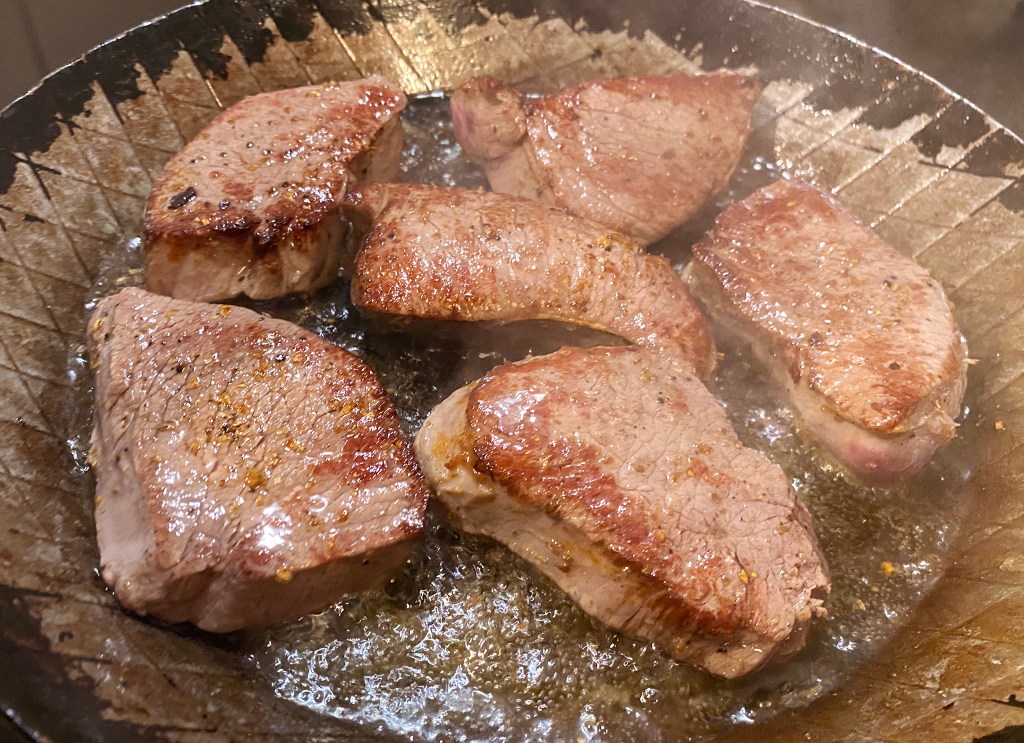 Die Steaks von beiden Seiten kurz und knackig anbraten. Die Pfanne muss richtig heiß sein.