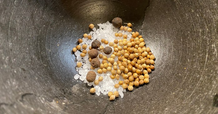 Die Gewürze im Mörser zerstoßen.