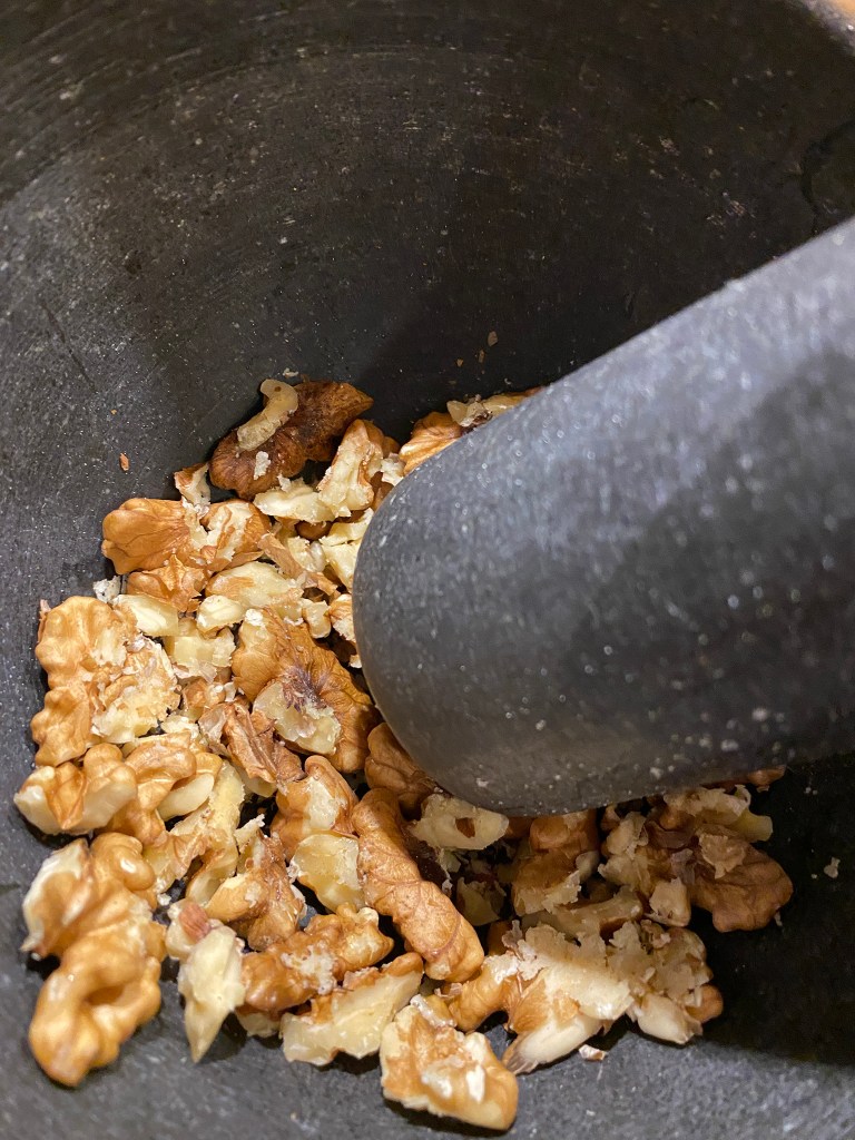 Die Walnüsse im Mörser ein wenig anstoßen. Die Nüsse mit einem EL Honig glasieren.