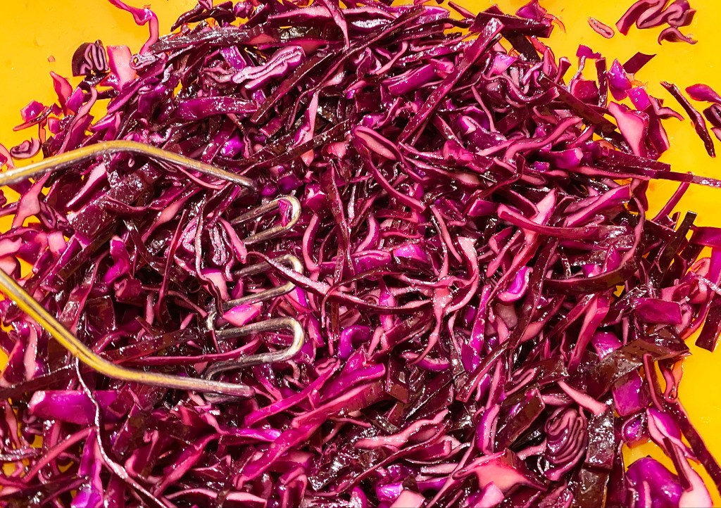 gerne mit Handschuhen, da die Hände sonst hinterher auch nach Rotkohl aussehen :).