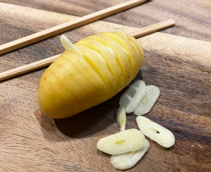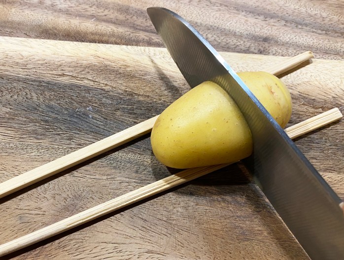 Kartoffel zwischen zwei Essstäbchen legen und diese bis zu den Essstäbchen einschneiden.