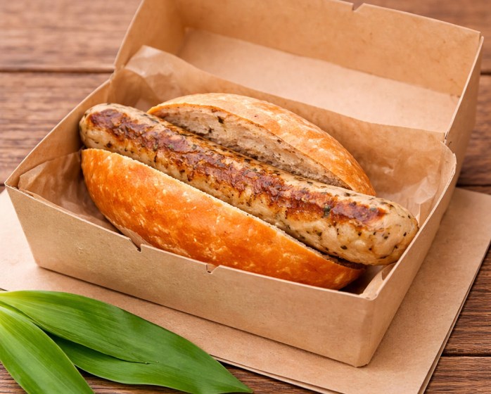 „WILDE BÄRLAUCH-BRATWURST“ im Brötchen