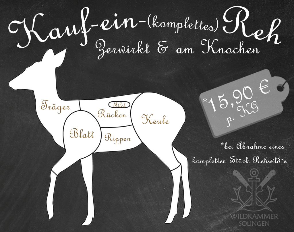 Auf Vorbestellung bekommt Ihr bei uns ein komplettes Stück Rehwild (Zerlegt und Vakuumiert) zum Vorzugspreis von 15,90 € per KG (am Knochen / bei Abnahme eines kompletten Stückes).